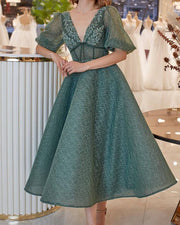 A-line Puffy Sleeves Lace V Neck Midi Prom Dresses