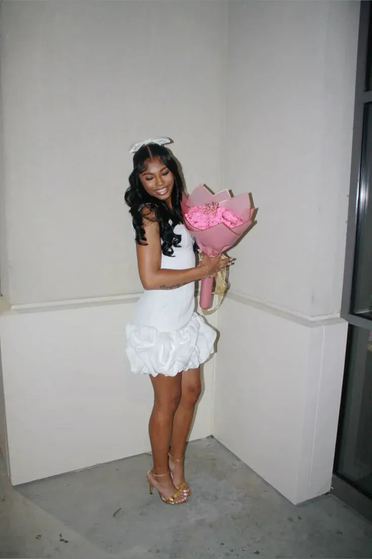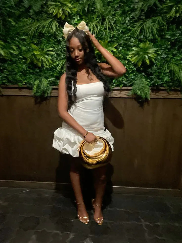 etyou's Elevate your chic and playful style with this white strapless ruffled mini dress. It features a structured bodice for sleek elegance, a ruffled hem for whimsical movement, and a strapless design for timeless charm. Paired with bold gold accessories, this dress is perfect for parties, social events, or any occasion where you want to embrace modern sophistication with a touch of fun allure.