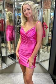 Sheath V Neck Hot Pink Ruched Short Homecoming Dress formal dresses Bridesmaid Dresses evening gown Prom Dress