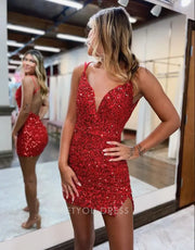 Sheath V Neck Red Sequin Sparkling Short formal dresses Bridesmaid Dresses evening gown Prom Dress Homecoming Dress