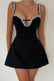 etyou's glamorous black mini dress features a bold deep V-neckline, structured fit, and sparkling crystal-embellished straps. The flared skirt adds playful elegance, making it ideal for club nights, parties, or sophisticated evening events.