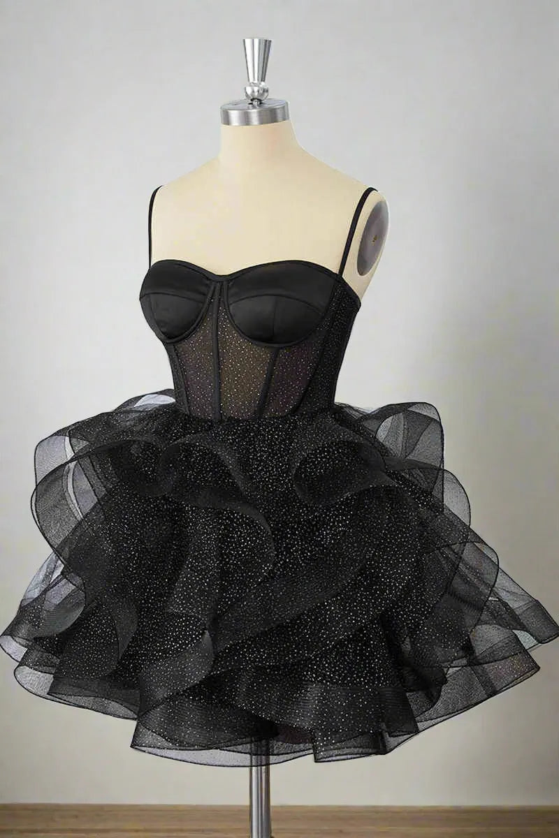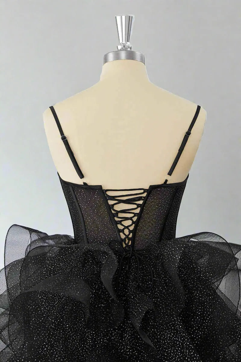 etyou's Elevate your formal style with this black strapless corset mini dress. It features a structured corset bodice with sheer glitter detailing, a voluminous ruffled tulle skirt that adds dramatic flair, and a lace-up back for a tailored fit. Perfect for red carpet events, proms, or any upscale occasion, this dress combines edgy sophistication and whimsical charm seamlessly. The classic black hue with glitter accents makes it a standout choice. Pair it with diamond jewelry and strappy heels to complete a refined ensemble.