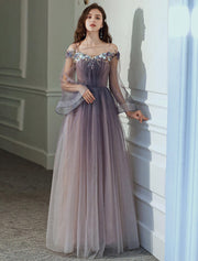 A-Line Minimalist Elegant Party Wear Prom Dress Off Shoulder Long Sleeve Floor Length Tulle with Appliques
