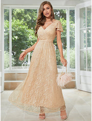 A-Line Wedding Guest Dresses Elegant Dress Party Wear Ankle Length Short Sleeve V Neck Chiffon with Ruffles