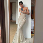 This glamorous party dress features a sleek mermaid silhouette with a minimalist spaghetti-strap neckline and an open cross-back design, crafted from luxe ivory sequin fabric that shimmers under light. Its form-fitting bodice hugs your curves, while the floor-length skirt falls in a fluid, body-skimming drape with a subtle flare at the hem.