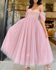 A-line Beaded Tulle Corset Midi Dress Prom Dresses