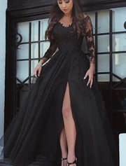 A-Line Evening Gown Floral Dress Formal Evening Floor Length Long Sleeve V Neck Wednesday Addams Family Lace with Slit Lace Insert