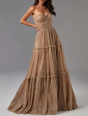 A-Line Evening Gown Glittering Dress Formal Wedding Guest Floor Length Sleeveless Strapless Tulle with Pleats