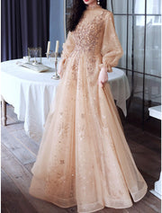 A-Line Glittering Elegant Engagement Formal Evening Dress High Neck Long Sleeve Floor Length Tulle with Sequin