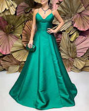 A-line High V Neck Long Satin Prom Dresses - US 2 / UK 6 / EU 32
