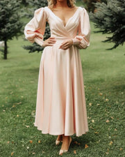 A-line Long Sleeve Midi Satin Prom Dresses