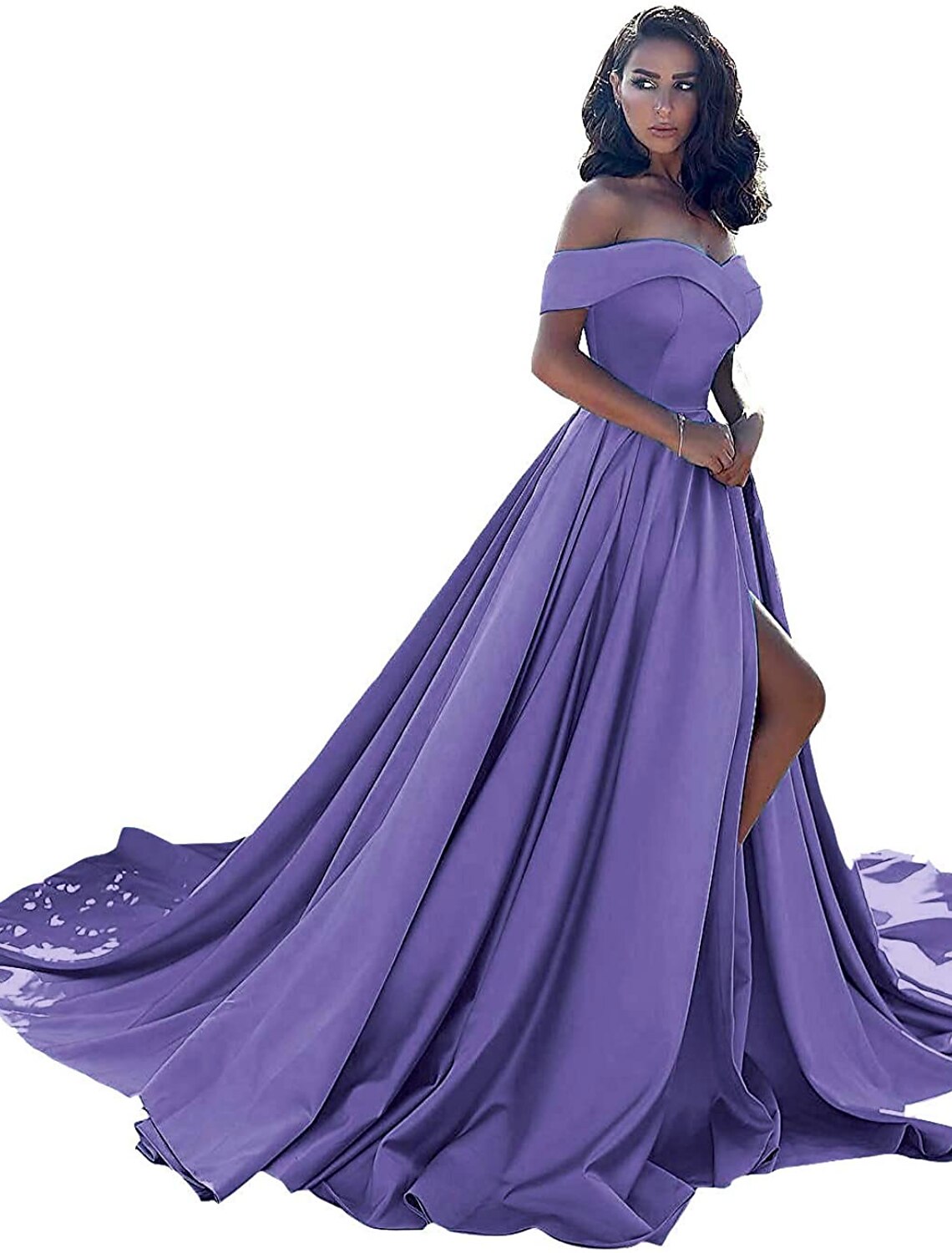 A-Line Minimalist Sexy Prom Formal Evening Dress Off Shoulder Sleeveless Chapel Train Satin with Split Front