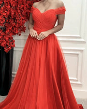 A-line Off The Shoulder Pleated Tulle Prom Dresses