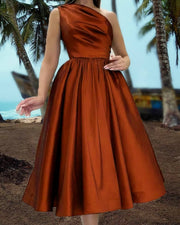 A-line One Shoulder Tea Length Satin Prom Dresses