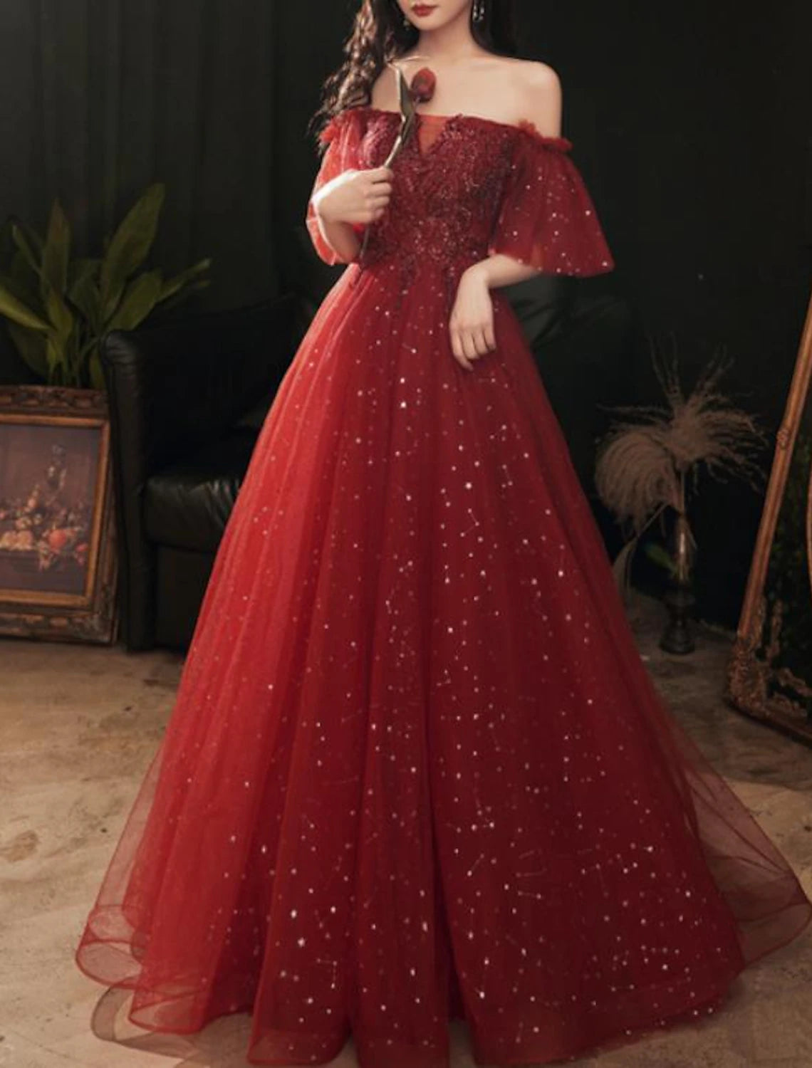 A-Line Party Dress Glittering Elegant Wedding Guest Formal Evening Dress Scoop Neck Short Sleeve Floor Length Tulle with Pleats Sequin