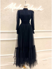 A-Line Prom Dresses Elegant Dress Formal Ankle Length Long Sleeve High Neck Tulle with Pleats Ruched