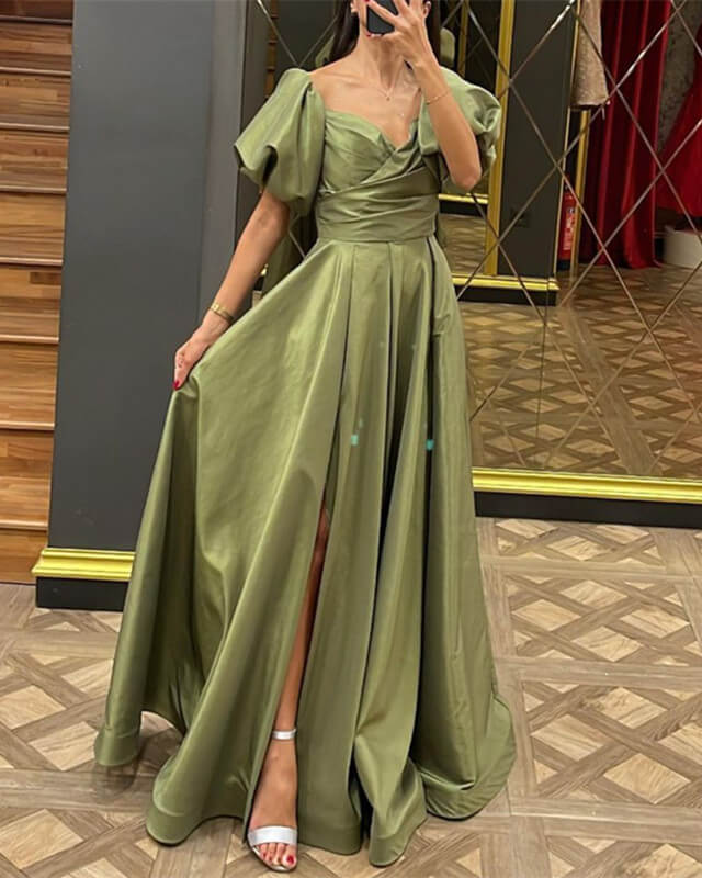 A-line Puffy Sleeves Long Satin Slit Prom Dresses