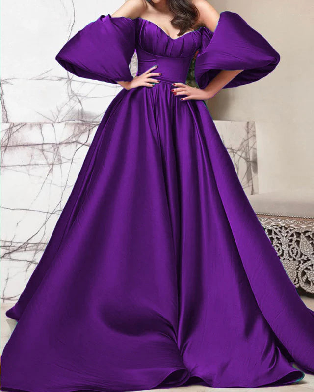 A-line Puffy Sleeves Satin Long Prom Dresses