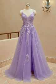 A Line Spaghetti Straps V Neck Tulle Slit Prom Dresses