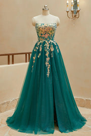 A Line StraplessTulle Slit Prom Dresses