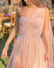 A-line Tulle One Shoulder Split Corset Dress Prom Dresses