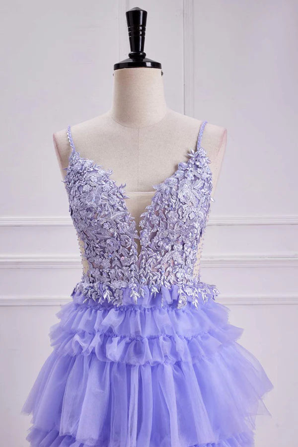 A-line V Neck Floral Layers Plunging Long Prom Dress