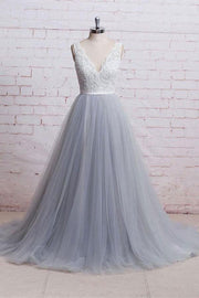 A-line V-neck Lace Bodice Tulle  Train Prom Dresses