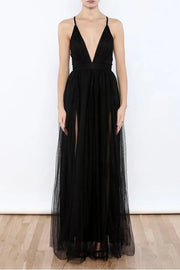 A-line V Neck Side Slit Tulle Evening Gowns Prom Dresses