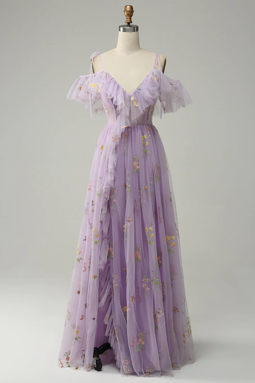 A-Line V-Neck Spaghetti Straps Embroidery Long Prom Dress with Slit