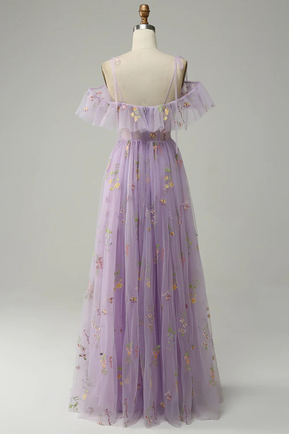 A-Line V-Neck Spaghetti Straps Embroidery Long Prom Dress with Slit - US 2 / UK 6 / EU 32