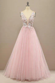A-line V Neck Tulle Floral Lace Prom Dress Formal Dress