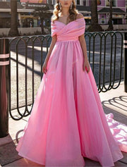 Ball Gown Prom Dresses High Split Dress Wedding Prom Court Train Short Sleeve Off Shoulder Stretch Chiffon with Slit
