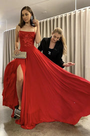 This glamorous prom dress is crafted from premium red stretch fabric, featuring a flowy A-line silhouette that cascades to the floor with a dramatic train. It boasts a sleek square neckline supported by delicate spaghetti straps, with the bodice adorned with intricate red floral embroidery for a romantic touch. The back features a bold crisscross lace-up closure with a tie detail, allowing for a fully customizable fit, while the skirt includes a high thigh slit for modern edge and ease of movement. The smooth, stretchy fabric ensures comfort even during long events, and the vibrant red hue is enhanced by the fabric’s subtle sheen, blending modernity with timeless allure.
