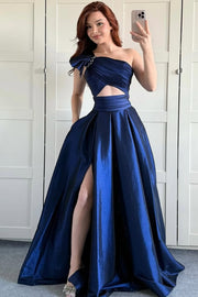 etyou's Elevate your formal style with this navy blue two-piece ballgown: a one-shoulder bodice (adorned with a statement bow and crystal detail) paired with a voluminous satin skirt featuring a thigh-high slit. The cutout waist adds modern allure, while the luxe satin fabric catches light for a luminous finish—ideal for prom, galas, or wedding events. The structured silhouette balances regal elegance and contemporary charm, perfect for pairing with sparkling heels and delicate jewelry to complete a showstopping ensemble.