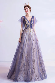 etyou's Elevate your ethereal elegance with this lilac tulle ball gown. It features a shimmering tulle skirt adorned with intricate gold floral embroidery and sequin detailing for opulent allure, a deep V-neckline with sheer tulle sleeves for refined charm, and a lace-up back design that blends vintage sophistication with modern grace. The soft lilac hue ensures a captivating finish, making it perfect for formal events, proms, or any occasion where you want to embrace timeless luxury with a touch of artistry and polished, red-carpet-worthy style.