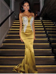 etyou's Elevate your opulent allure with this gold satin mermaid maxi dress. It features luxurious satin fabric with an embellished sweetheart neckline and thin spaghetti straps for glamorous charm, a figure-hugging mermaid silhouette that accentuates curves, and a flowing train for dramatic movement. The rich gold hue and tailored design make it perfect for red carpet events, formal galas, or any occasion where you want to embrace sophisticated, show-stopping style.