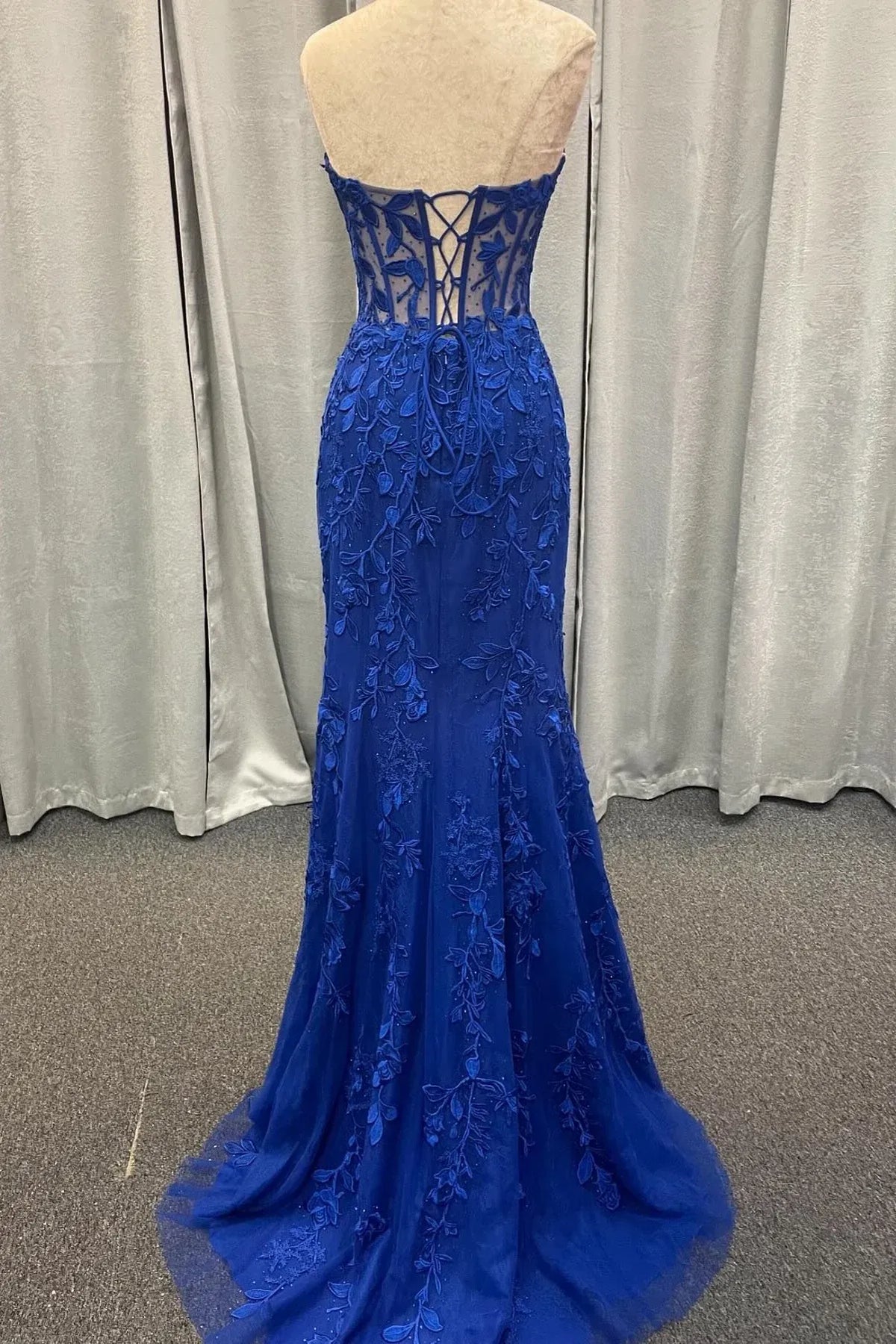etyou's Elevate your romantic allure with this lavender lace strapless mermaid gown. It features intricate lace detailing with a strapless neckline for opulent charm, a mermaid silhouette with a high slit and corset back for refined elegance, and a flowing skirt that adds a touch of glamorous flair. The soft lavender hue ensures a captivating finish, making it perfect for proms, weddings, or any occasion where you want to embrace timeless luxury with polished, show-stopping style.