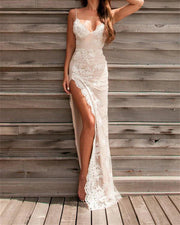 Sheath V Neck Split Backless Lace Appliques Sexy Prom Dresses