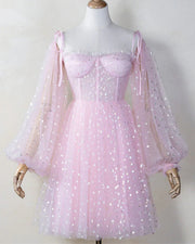 Sparkle Starry Tulle Formal Evening Gown Puffy Sleeve Prom Dress