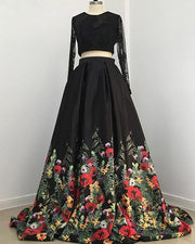 Two Piece Lace Floral Print Sexy Open Back Long Sleeve High Neck Prom Dresses