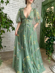 V neck tulle lace long prom dress - US 2 / UK 6 / EU 32