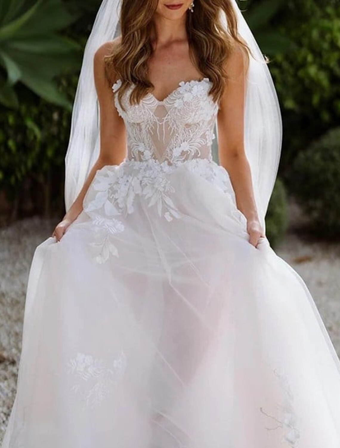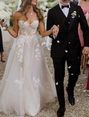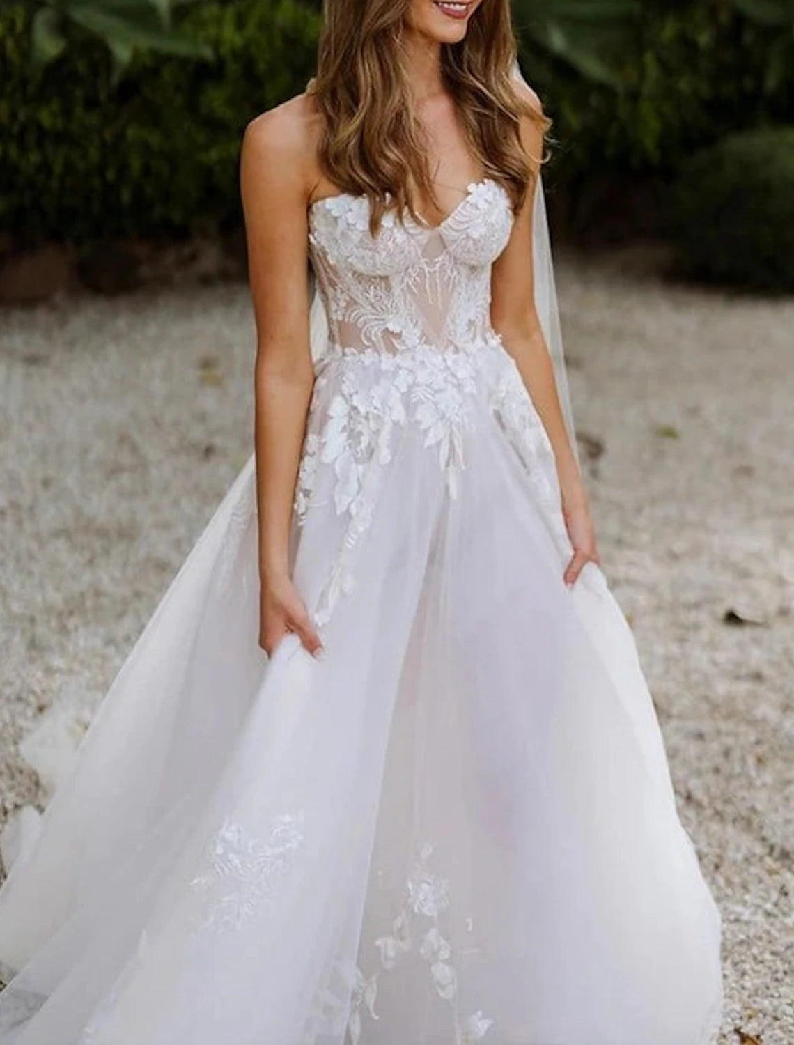 Beach Boho Wedding Dresses A-Line Sweetheart Strapless Sweep / Brush Train Satin Bridal Gowns With Appliques Solid Color - US 2 / UK 6 / EU 32