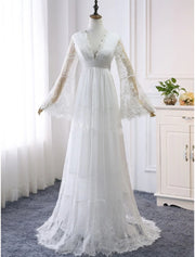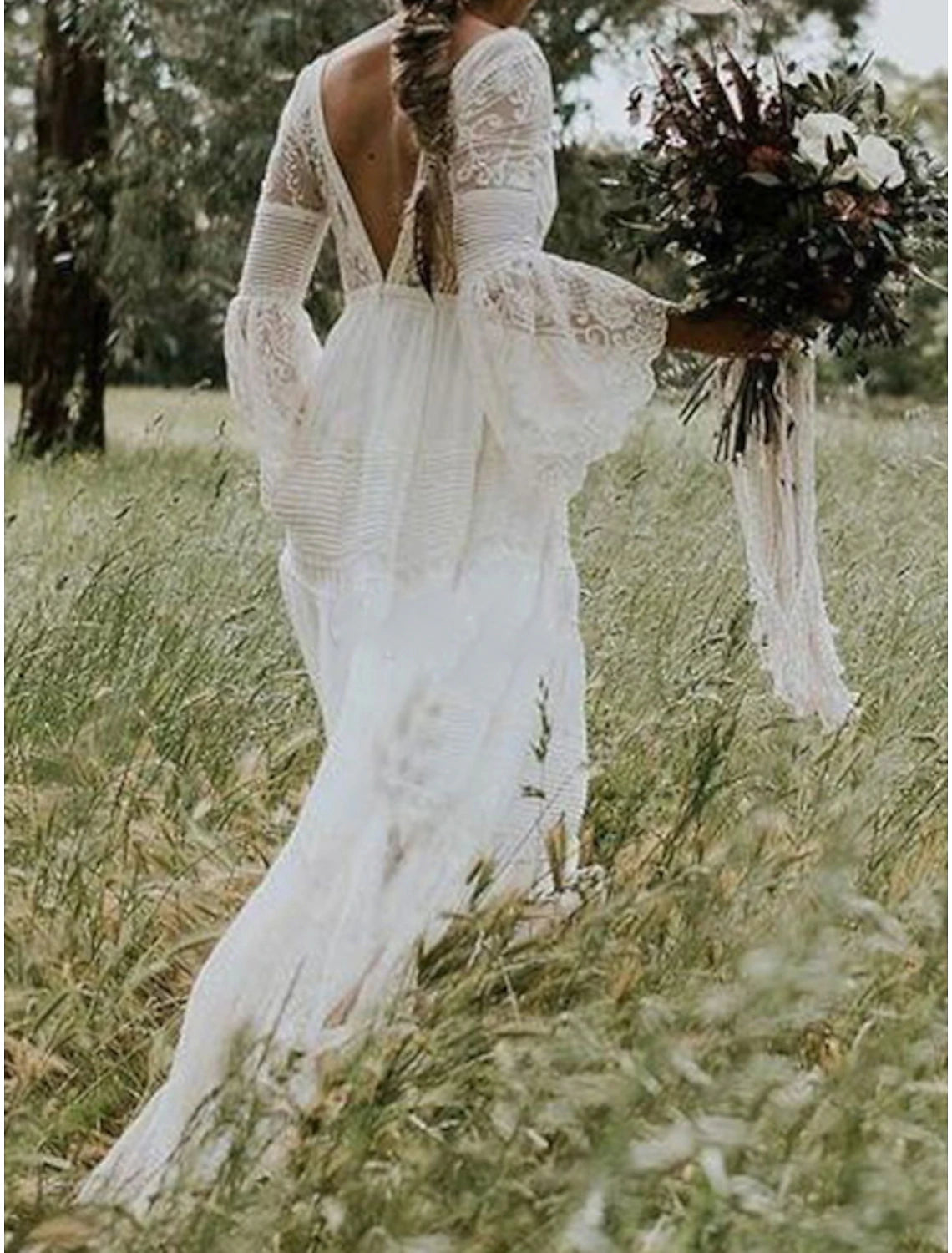 Beach Boho Wedding Dresses A-Line V Neck Long Sleeve Floor Length Lace Bridal Gowns With Lace