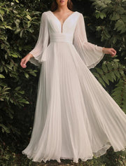 Beach Casual Wedding Dresses A-Line V Neck Long Sleeve Floor Length Chiffon Bridal Gowns With Solid Color