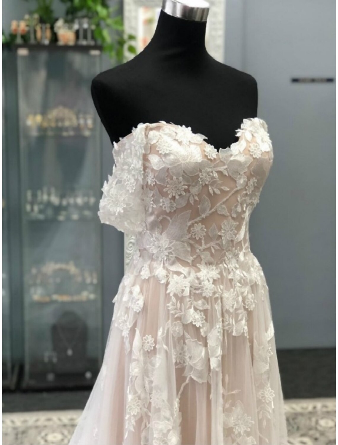Beach Formal Wedding Dresses A-Line Sweetheart Short Sleeve Court Train Lace Bridal Gowns With Pleats Appliques - US 2 / UK 6 / EU 32