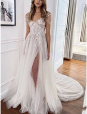 Beach Formal Wedding Dresses A-Line V Neck Short Sleeve Court Train Lace Bridal Gowns With Pleats Split Front