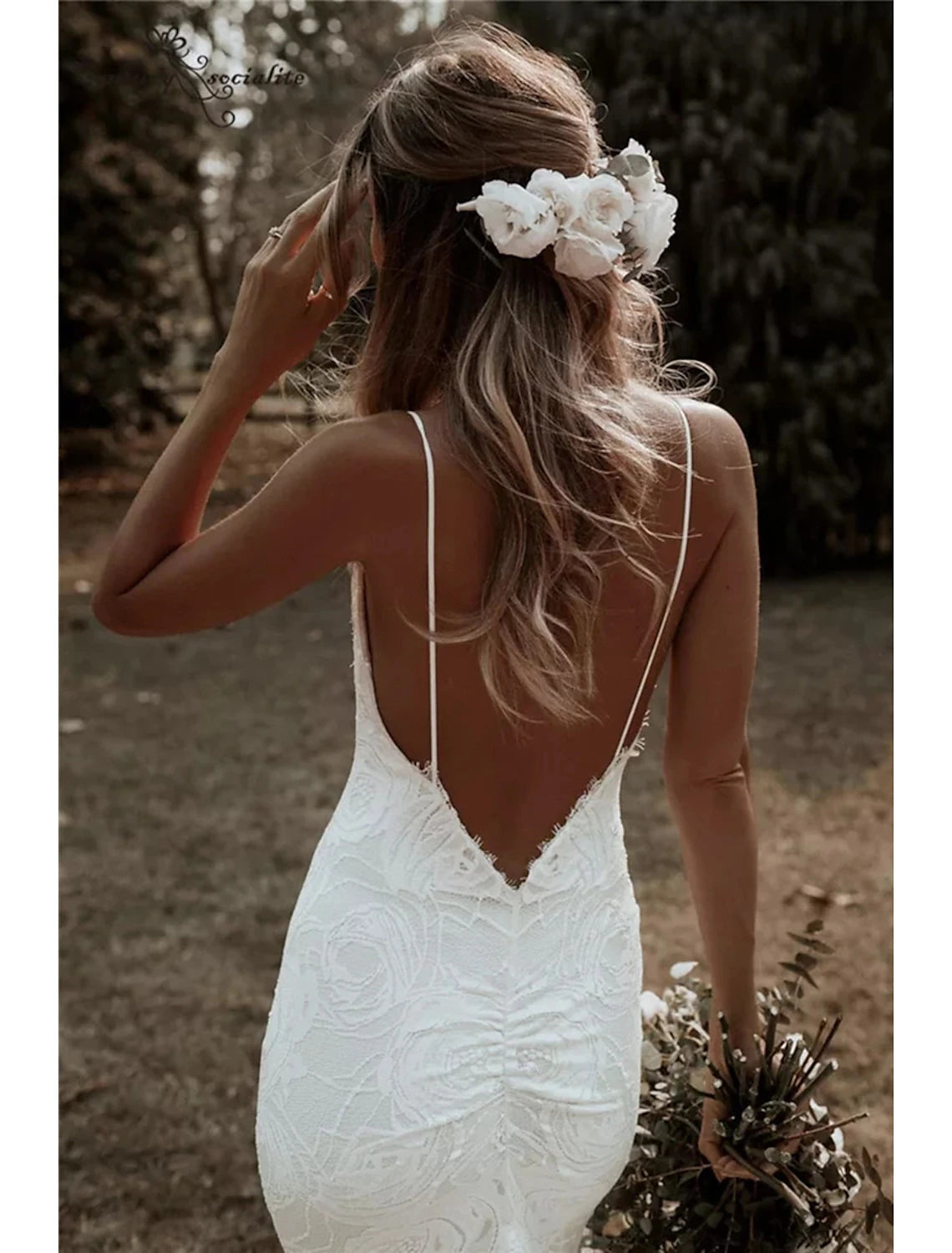 Beach Open Back Sexy Boho Wedding Dresses Mermaid / Trumpet Camisole V Neck Spaghetti Strap Court Train Lace Bridal Gowns With Appliques - US 2 / UK 6 / EU 32