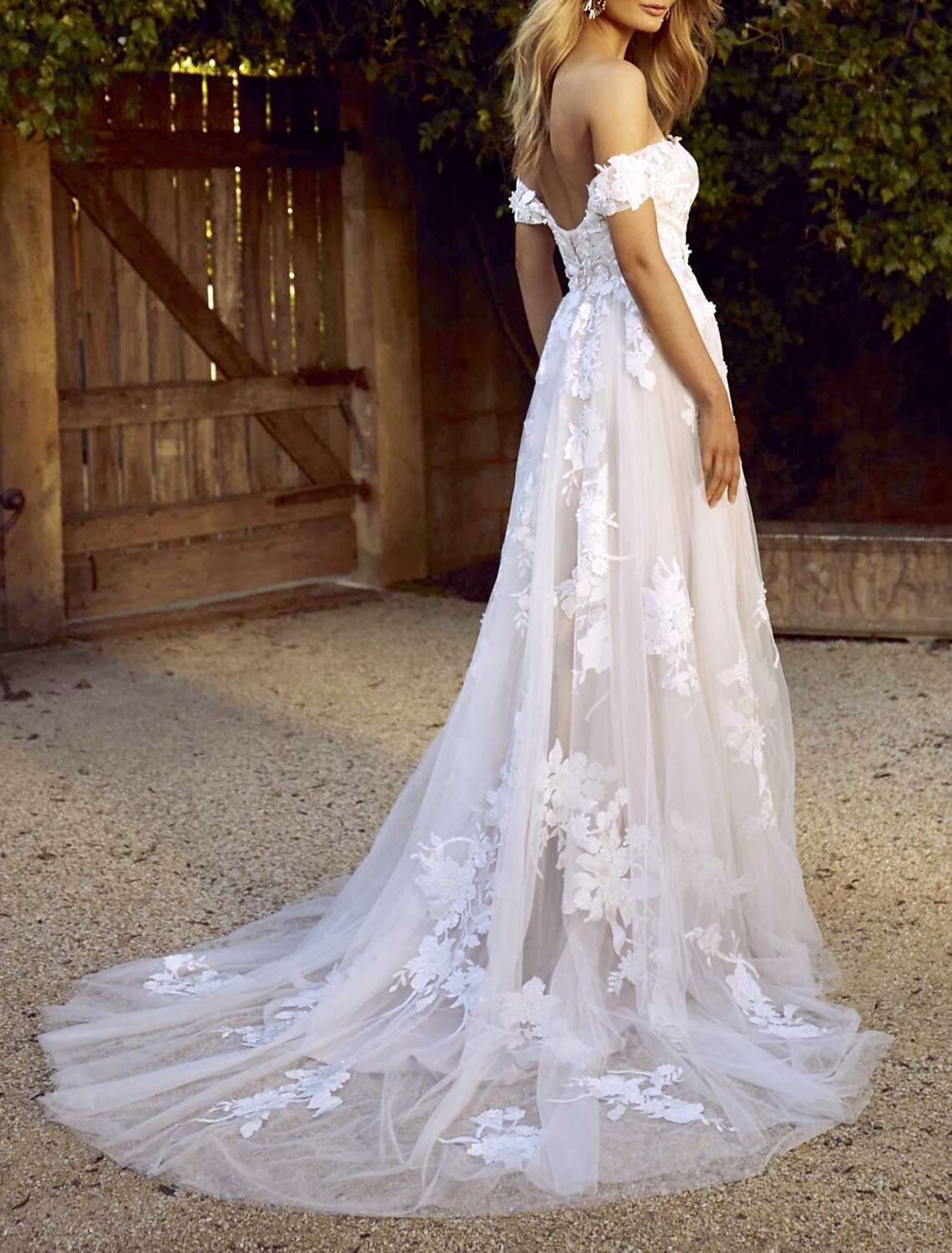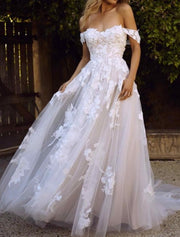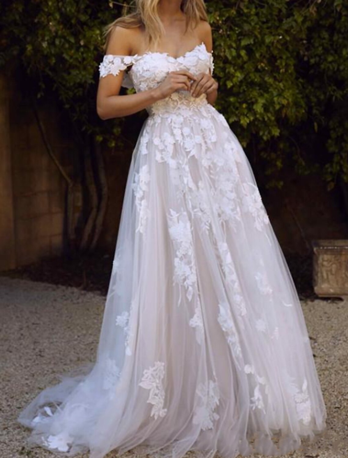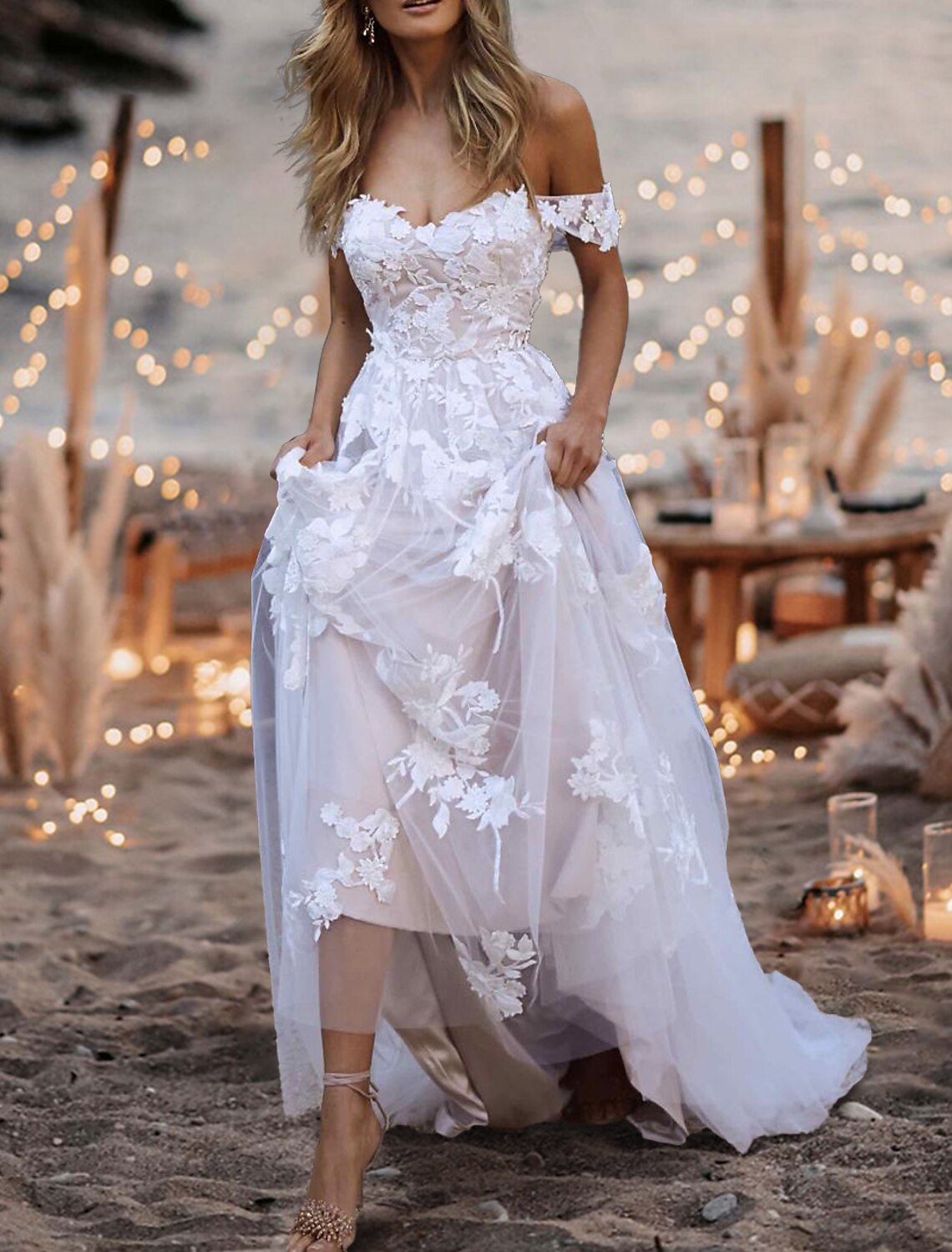 Beach Wedding Dresses A-Line Off Shoulder Cap Sleeve Sweep / Brush Train Lace Bridal Gowns With Lace Embroidery