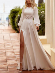 Casual Boho Wedding Dresses A-Line Boat Neck Long Sleeve Floor Length Chiffon Bridal Gowns With Embroidery Solid Color