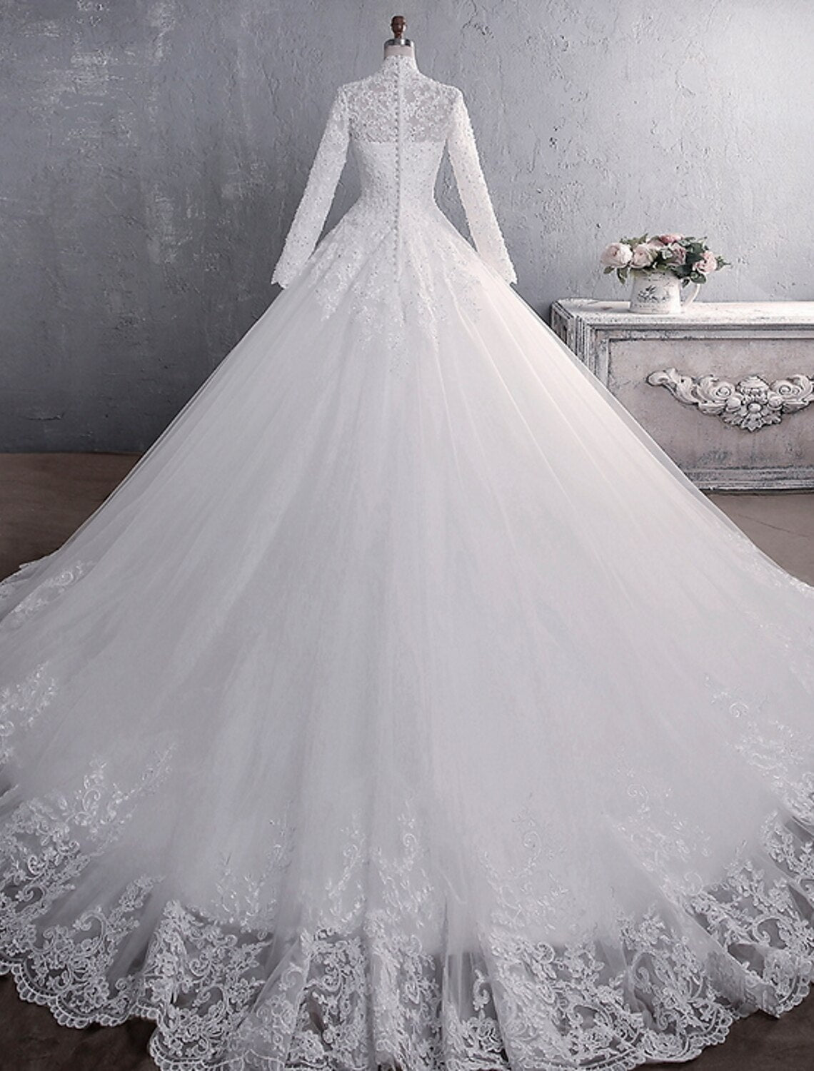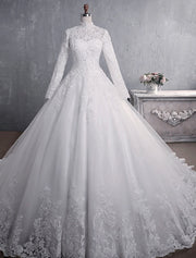 Engagement Formal Fall Wedding Dresses Ball Gown High Neck Long Sleeve Court Train Lace Church Bridal Gowns With Appliques - US 2 / UK 6 / EU 32